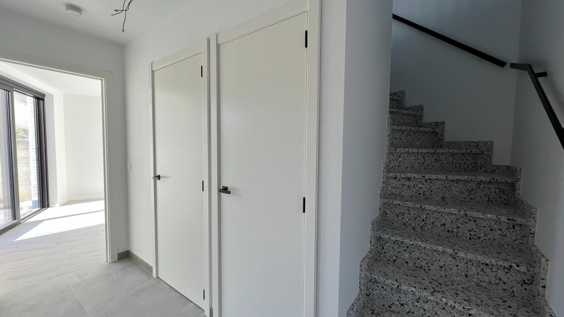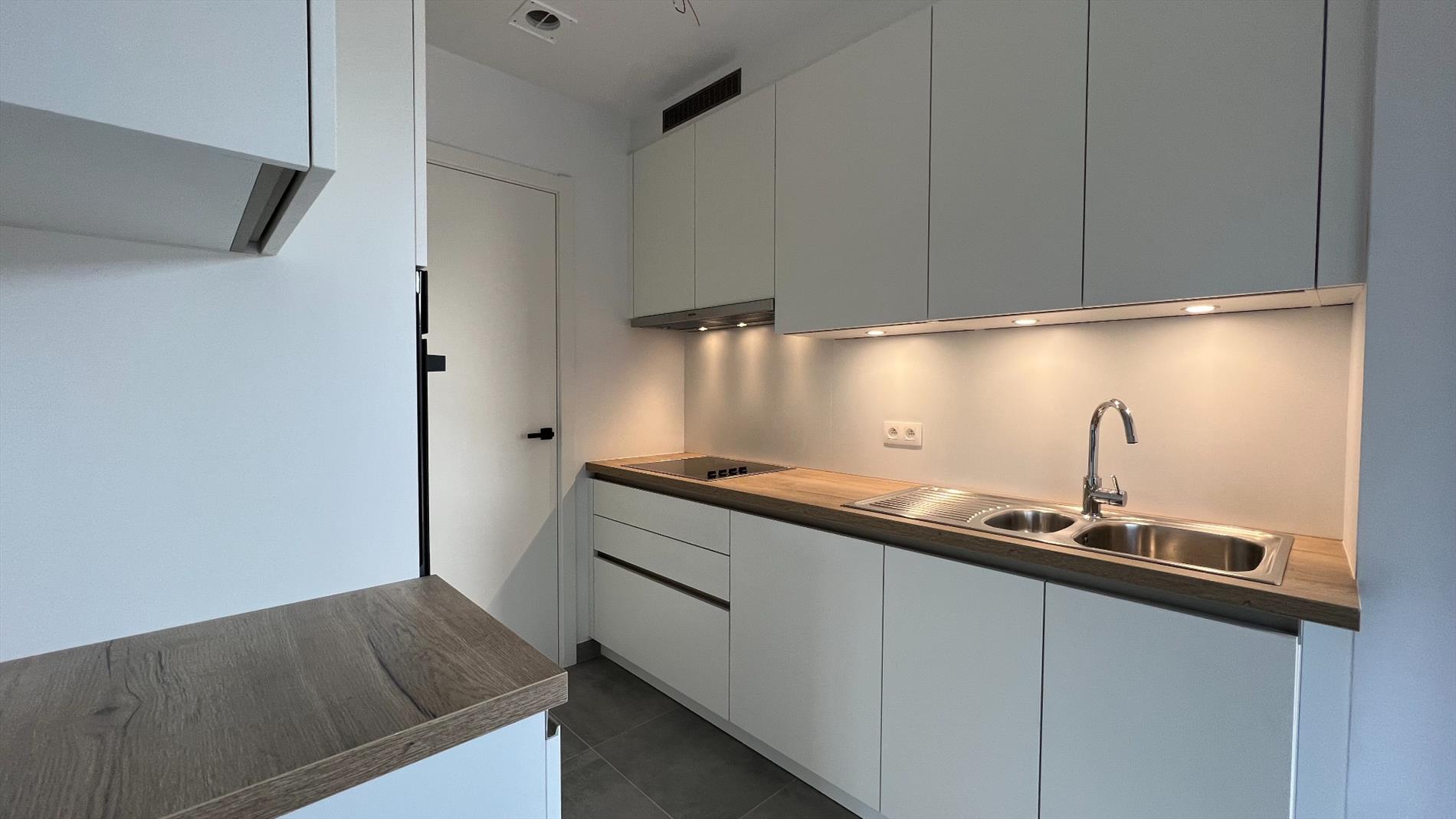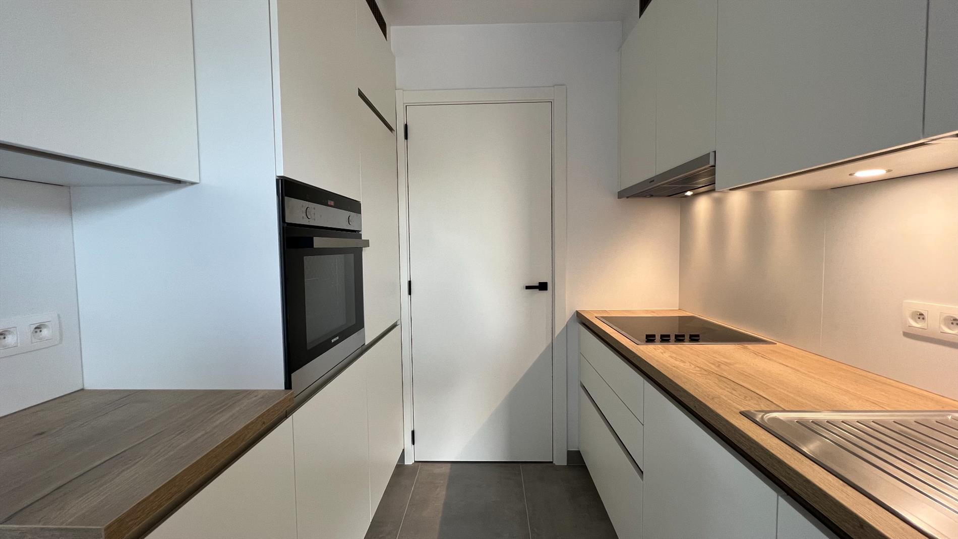 Op het gelijkvloers zijn 2 slaapkamers voorzien en een douchekamer met afzonderlijk toilet. Op het eerste verdiep bevindt zich de woonkamer met een open volledig ingerichte keuken en bijhorende berging. Er is zowel een terras op het gelijkvloers als een terras op het eerste verdiep. De bewoonbare oppervlakte bedraagt ongeveer 82m².
