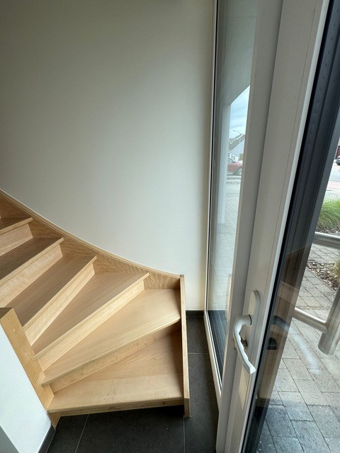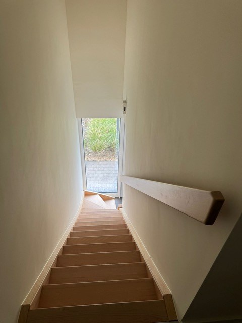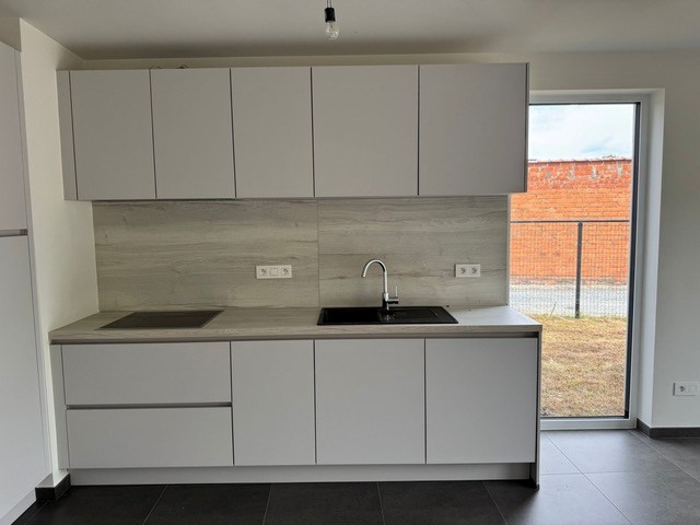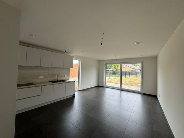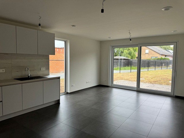 Op het gelijkvloers bevindt zich de garage, een lichtrijke leefruimte met zicht op de tuin en een geïntegreerde keuken. De keuken is volledig uitgerust met oven, kookplaat, dampkap en vaatwasmachine. Daarnaast is er op deze verdieping ook een apart toilet aanwezig.