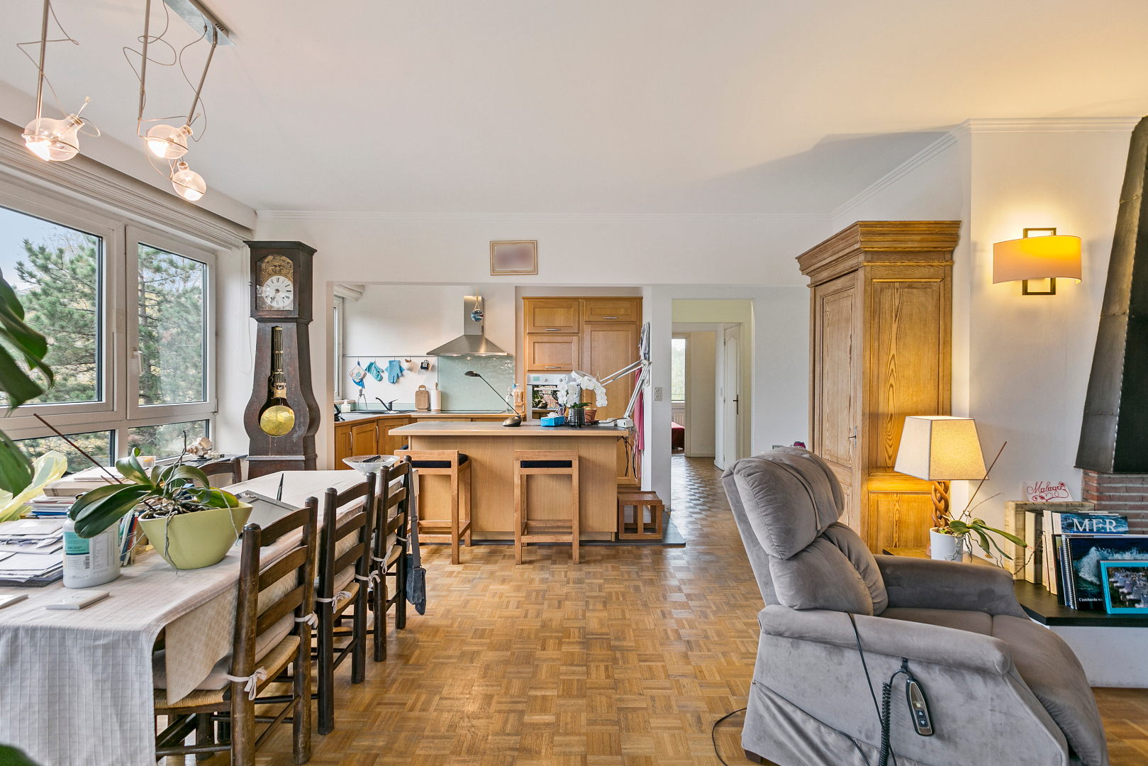 Living van ongeveer 45m² met open haard en open ingerichte keuken